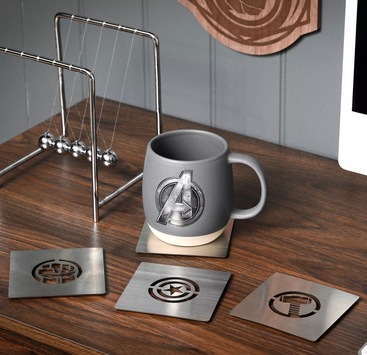 Geef je interieur een krachtige upgrade met deze Marvel Avengers set van 4 zilveren metalen onderzetters. Elk stuk is voorzien van een iconisch symbool van de Avengers, zoals Iron Man, Thor, Captain America en een krachtige gebalde vuist die de superheldenenergie vertegenwoordigt.